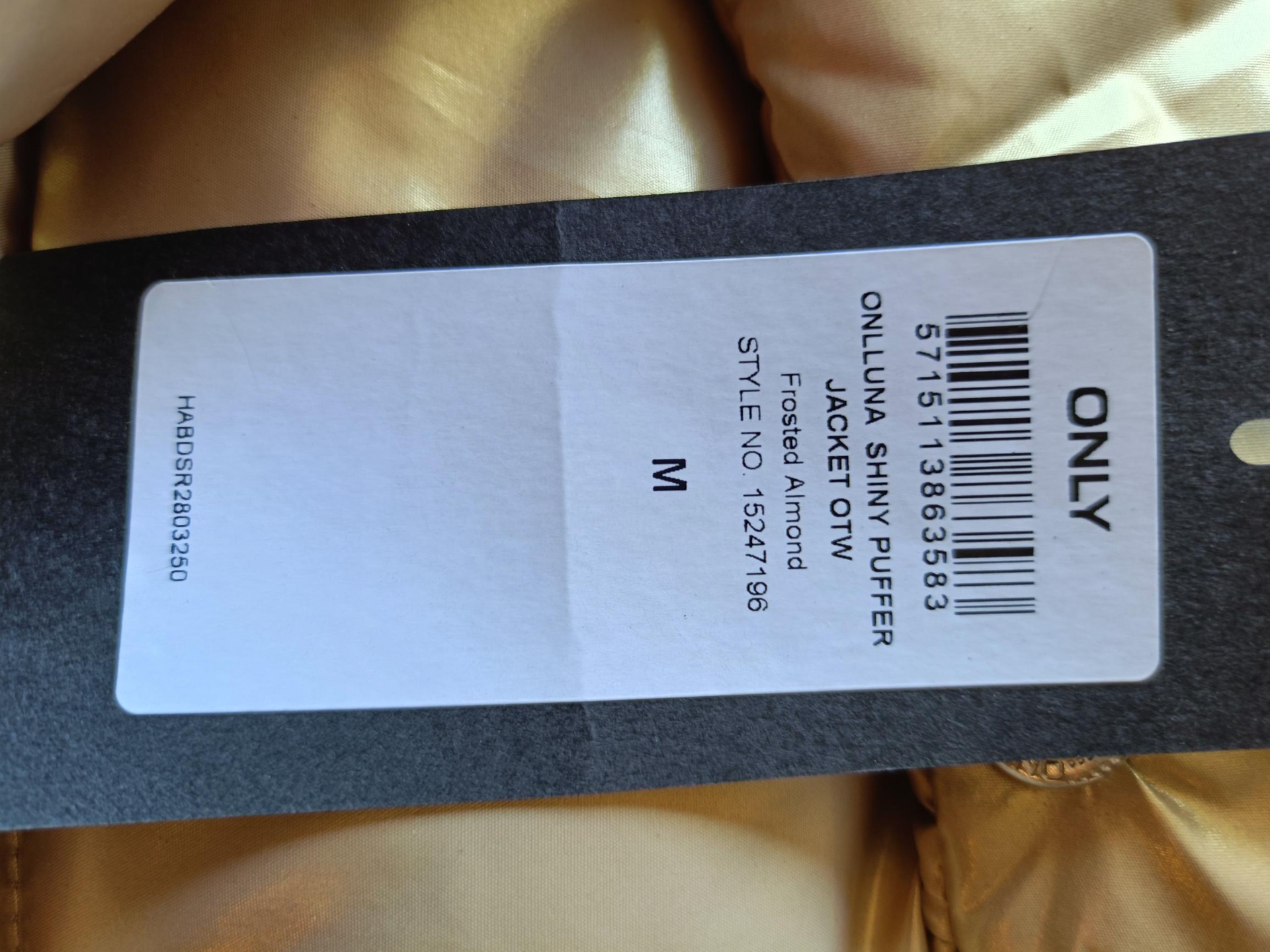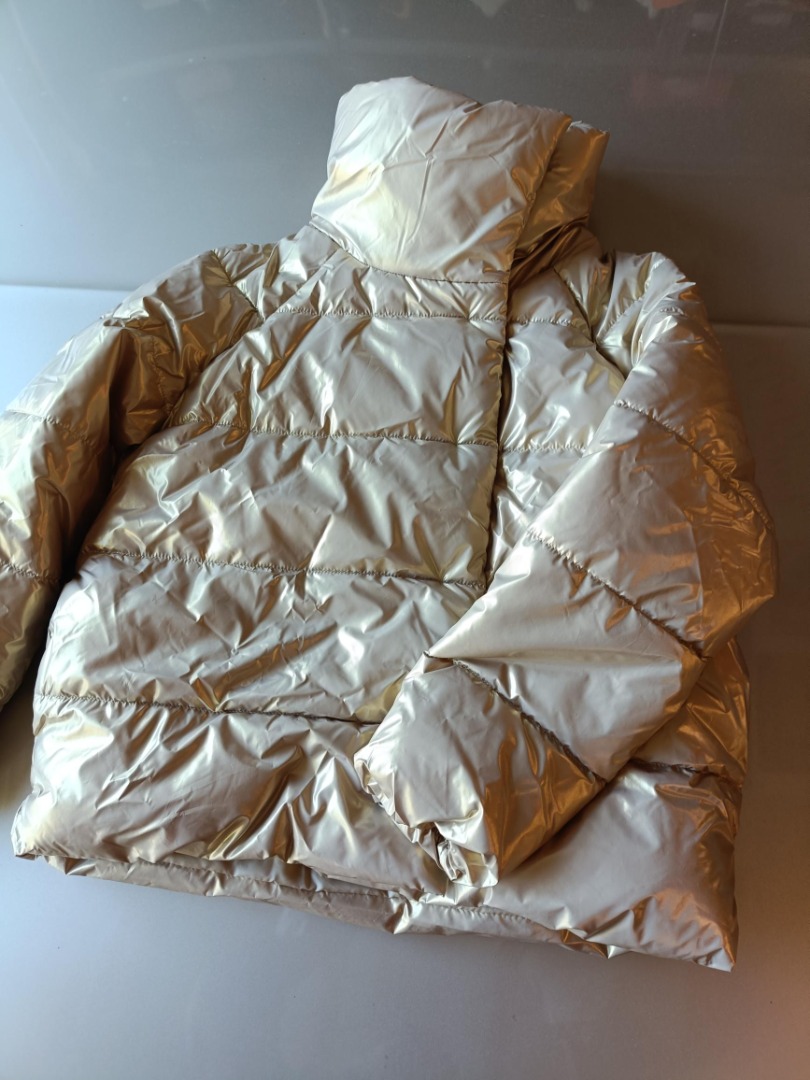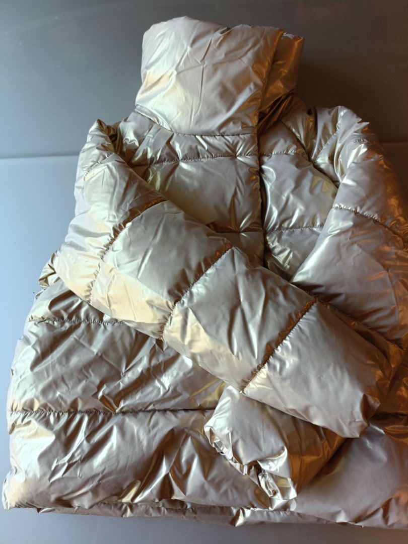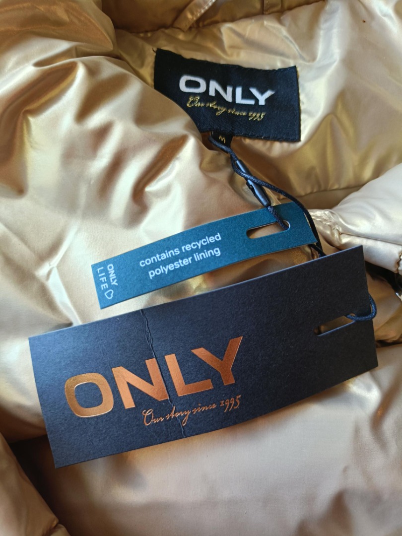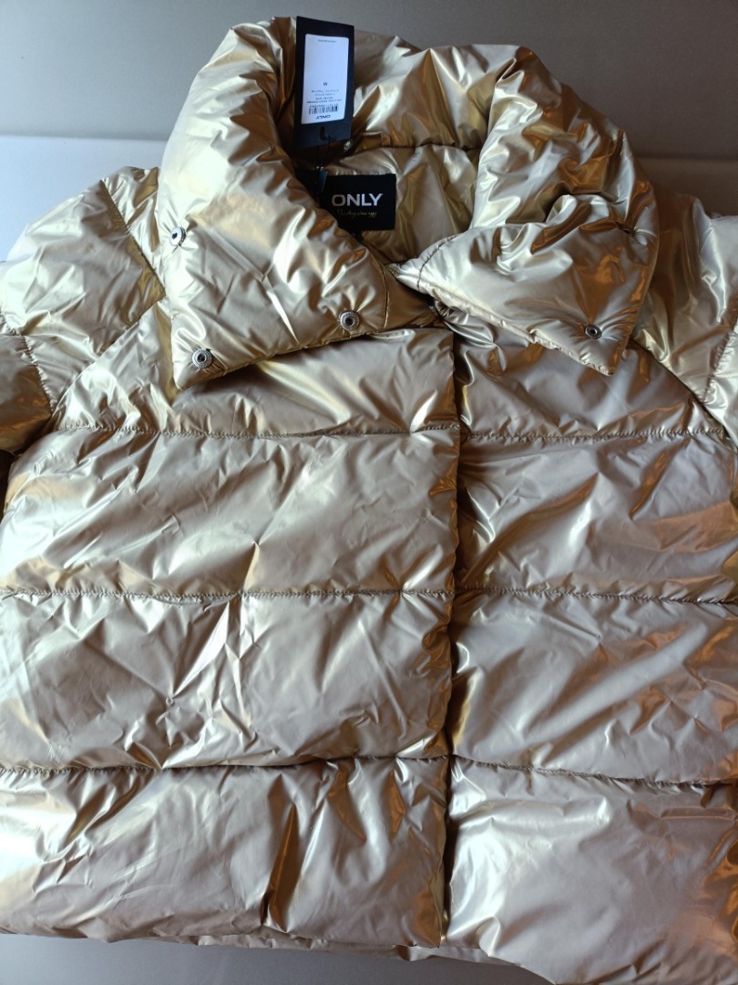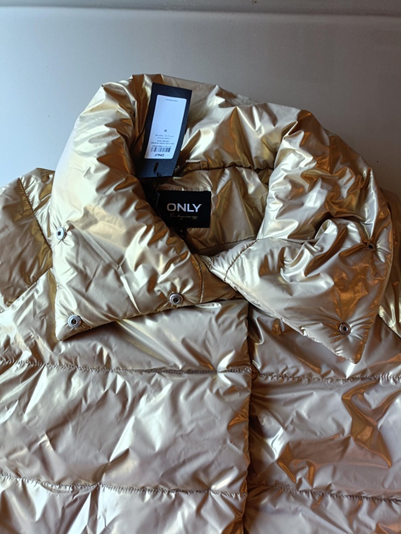 Mooie warme winterjas in de kleur goud, twee zakken en hoge kraag, maat M. Merk Only.