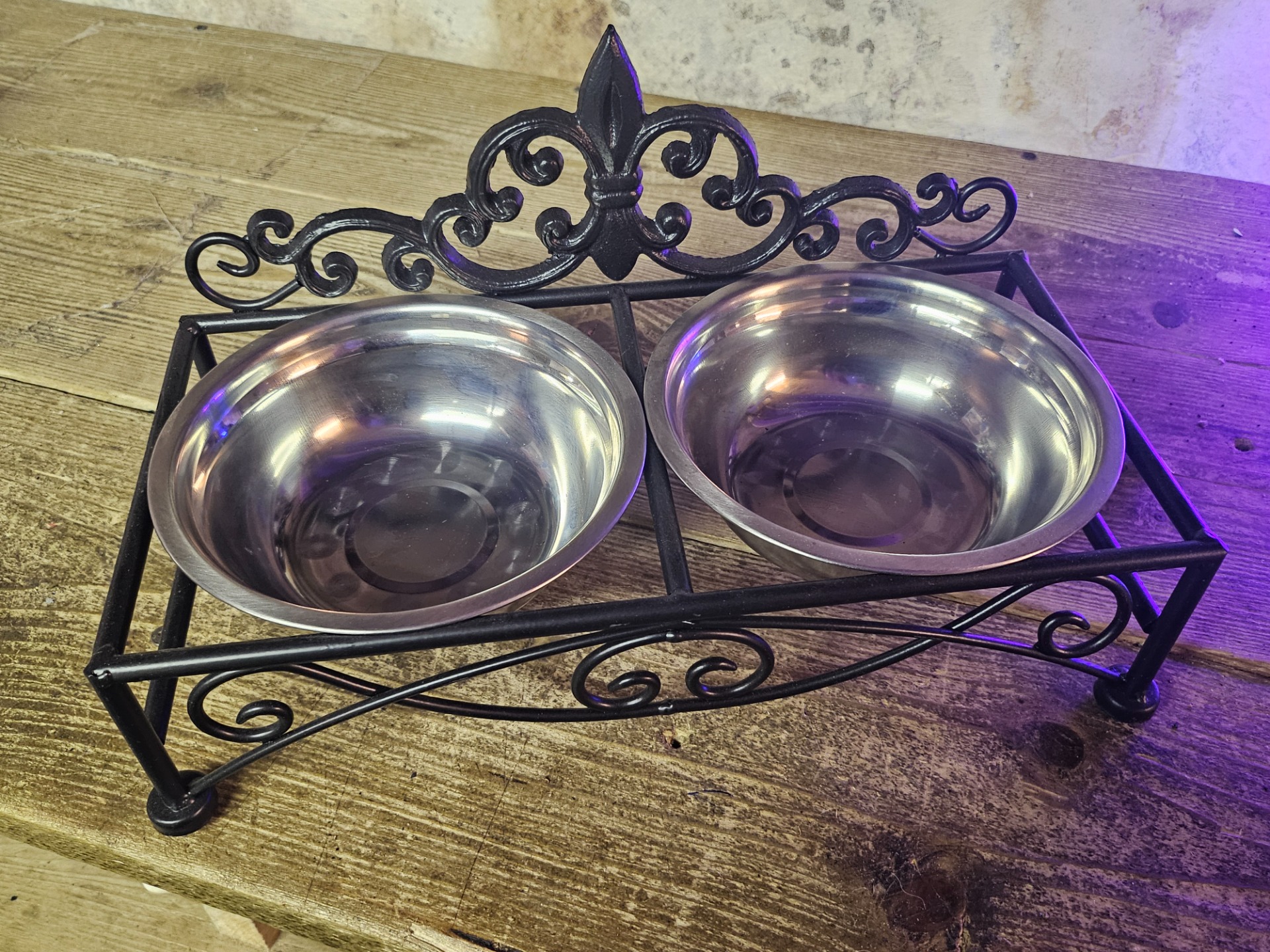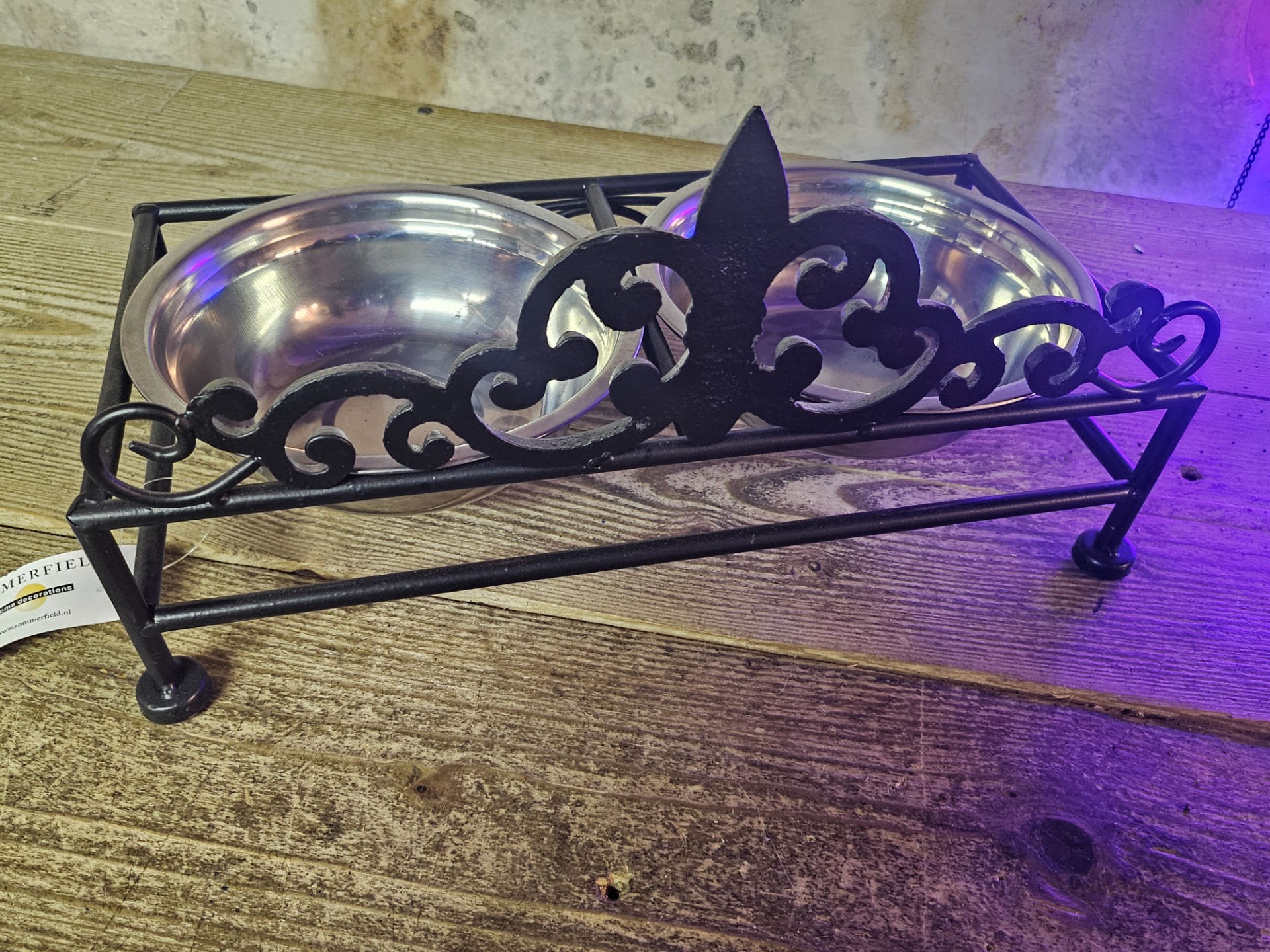 Mooie voerbak dubbel voor kleine middelgrote hond of kat natuurlijk, kleur zwart, afmetingen: 36 cm lang, 17 cm breed, 9 cm hoog, met puntr 19 cm hoog.