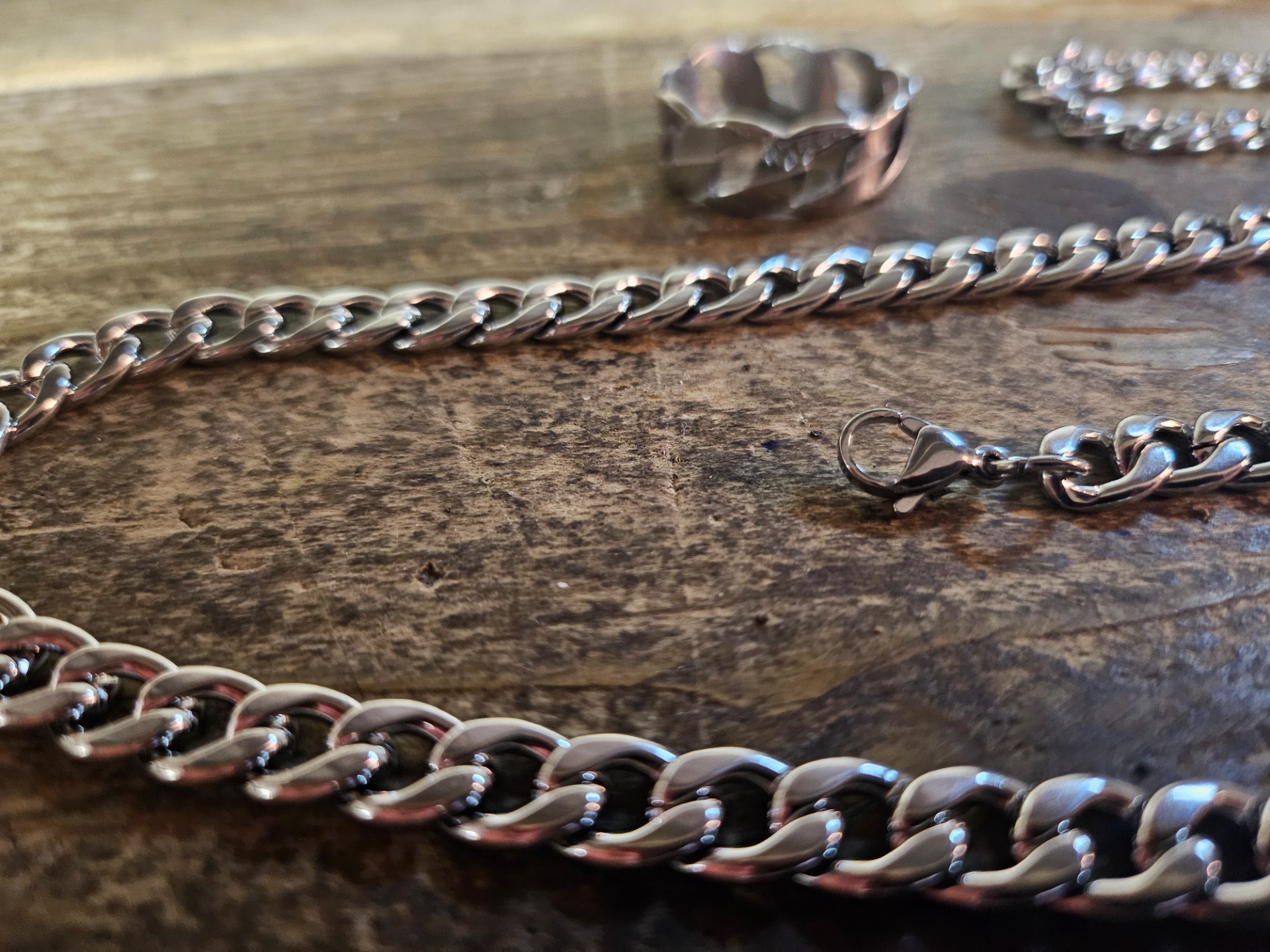 rvs set met ring armband en ketting, kettinglengte: 59cm, armbandlengte: 19cm, doorsnee ring: 13 mm, schakeldikte: 4mm, ringbteedte: 8mm.