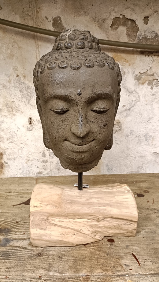 Mooi zwaar Boeddha hoofd van steen, weegt 5 kg. Hoogte is 44 cm.