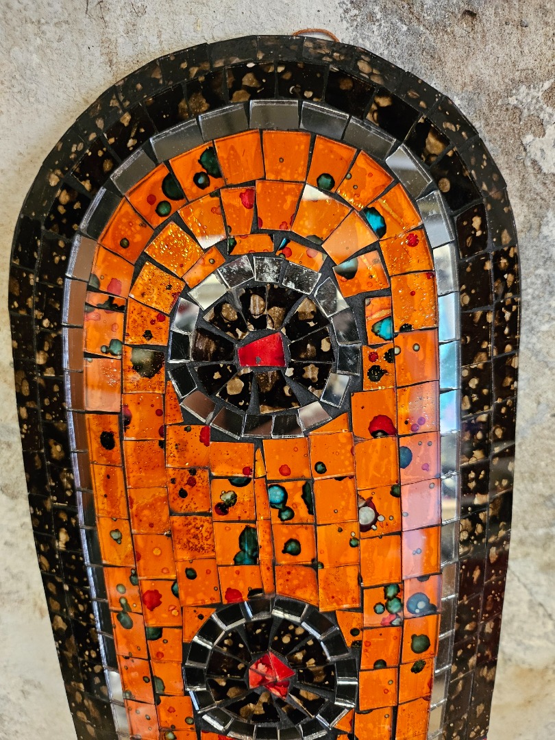 Prachtig masker van hout geheel ingelegd met kleine glazen mozaiek steentjes. Lengte: 50 cm, breed: 16 cm. gewicht: 546 gram